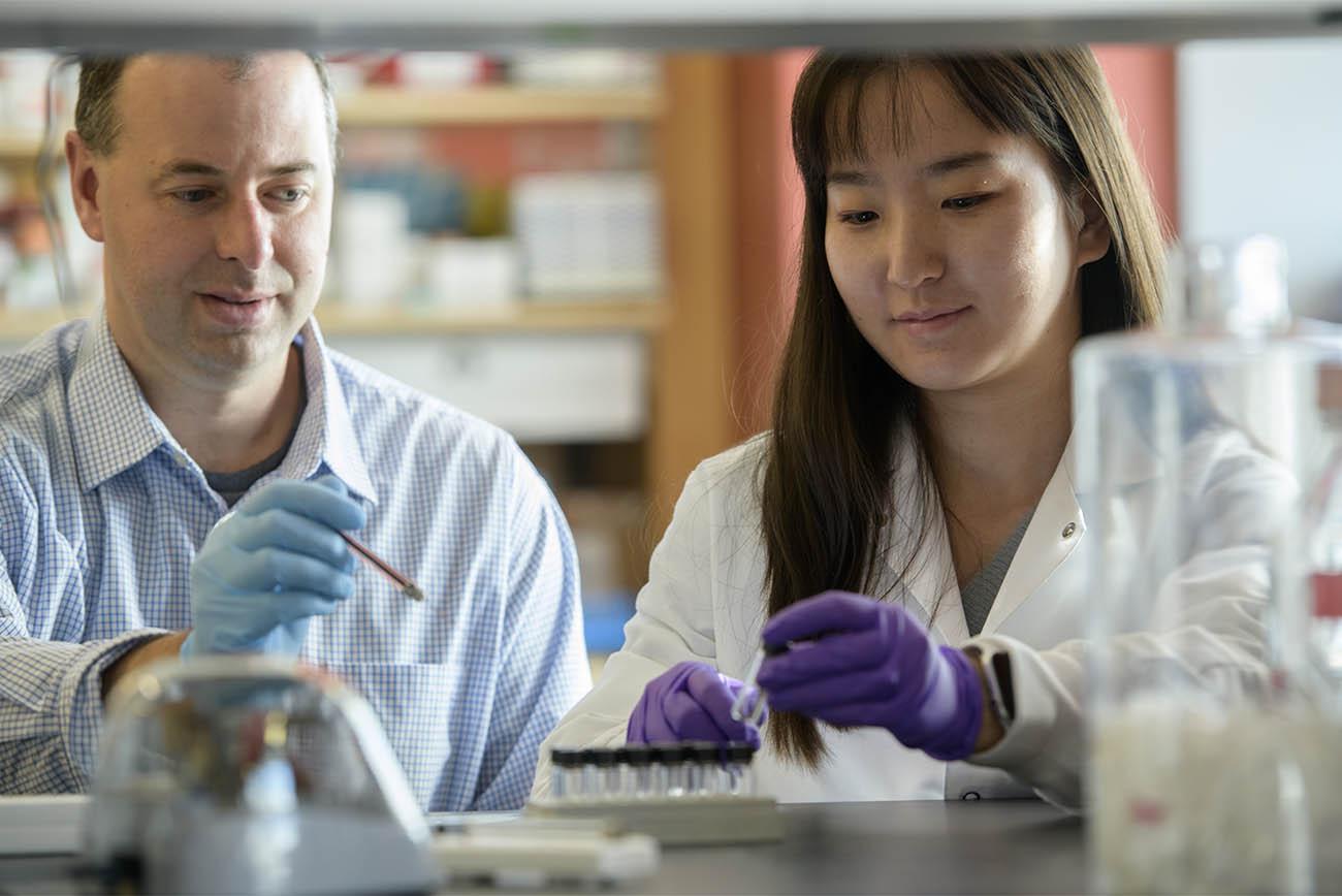 John G. Purdy, PhD (left), associate professor of immunobiology, with Yuecheng Xi, PhD, then a postdoctoral researcher with the Purdy Lab, which investigates the inner workings of a common virus.